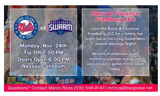 We are excited to invite you to a family-fun night out at the Long Island Nets Jewish Heritage Night! Come cheer on the Long Island Nets as they take on the Greensboro Swarm and enjoy an evening of community, basketball, and celebration. All fans in attendance are invited to a player autograph session immediately following the game in the lower lobby.