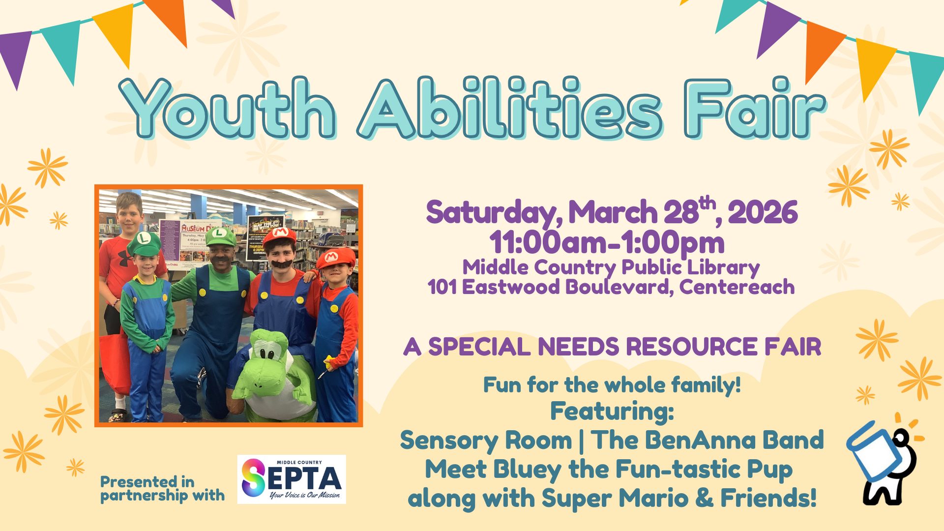 A special needs resource fair and family fun day! Meet representatives from various organizations and learn about their resources, services and activities for children and teens. Enjoy a sensory space, crafts, activities and meet Bluey the Fun-tastic Pup along with Super Mario and Friends! Join us for a special music performance at 1:00pm with the BenAnna Band.